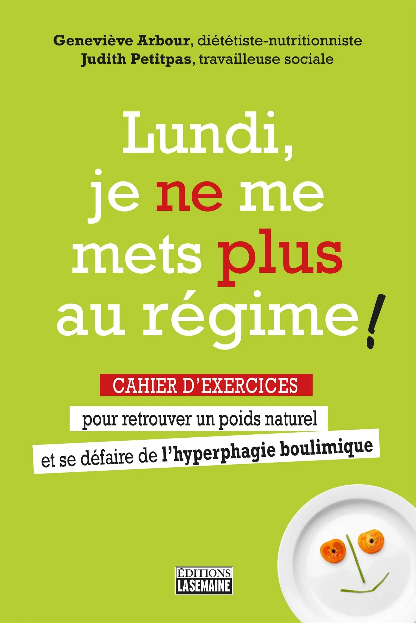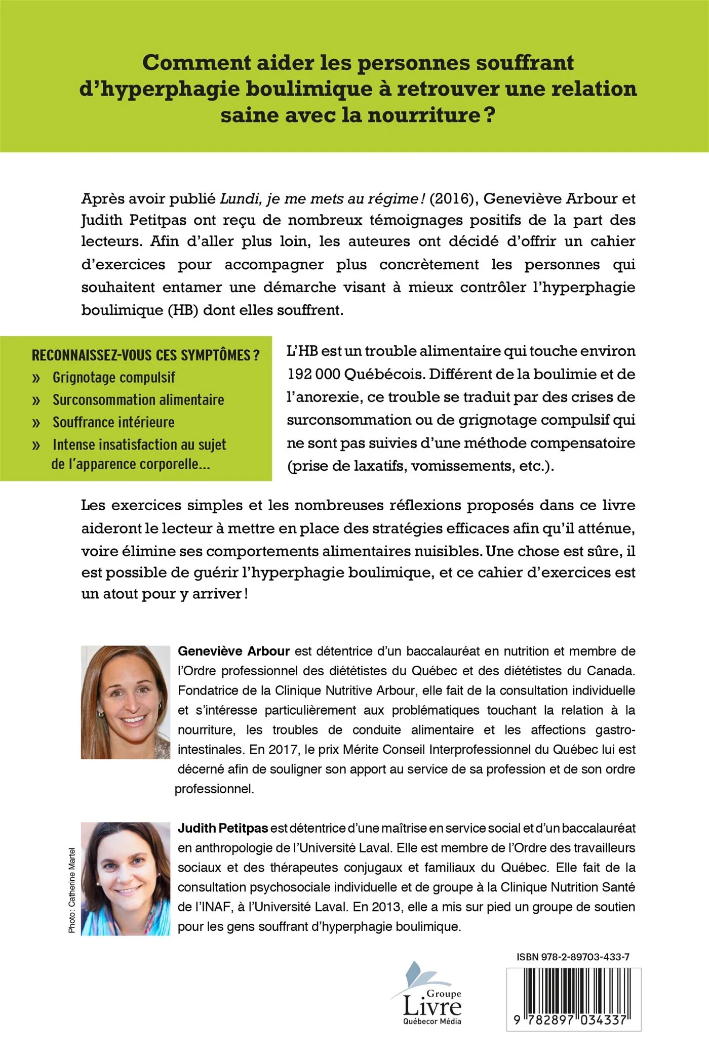 Après avoir publié Lundi, je me mets au régime! (2016), Geneviève Arbour et Judith Petitpas ont reçu de nombreux témoignages positifs de la part des lecteurs. Afin d’aller plus loin, les auteures ont décidé d’offrir un cahier d’exercices pour accompagner plus concrètement les personnes qui souhaitent entamer une démarche visant à mieux contrôler l’hyperphagie boulimique (HB) dont elles souffrent.